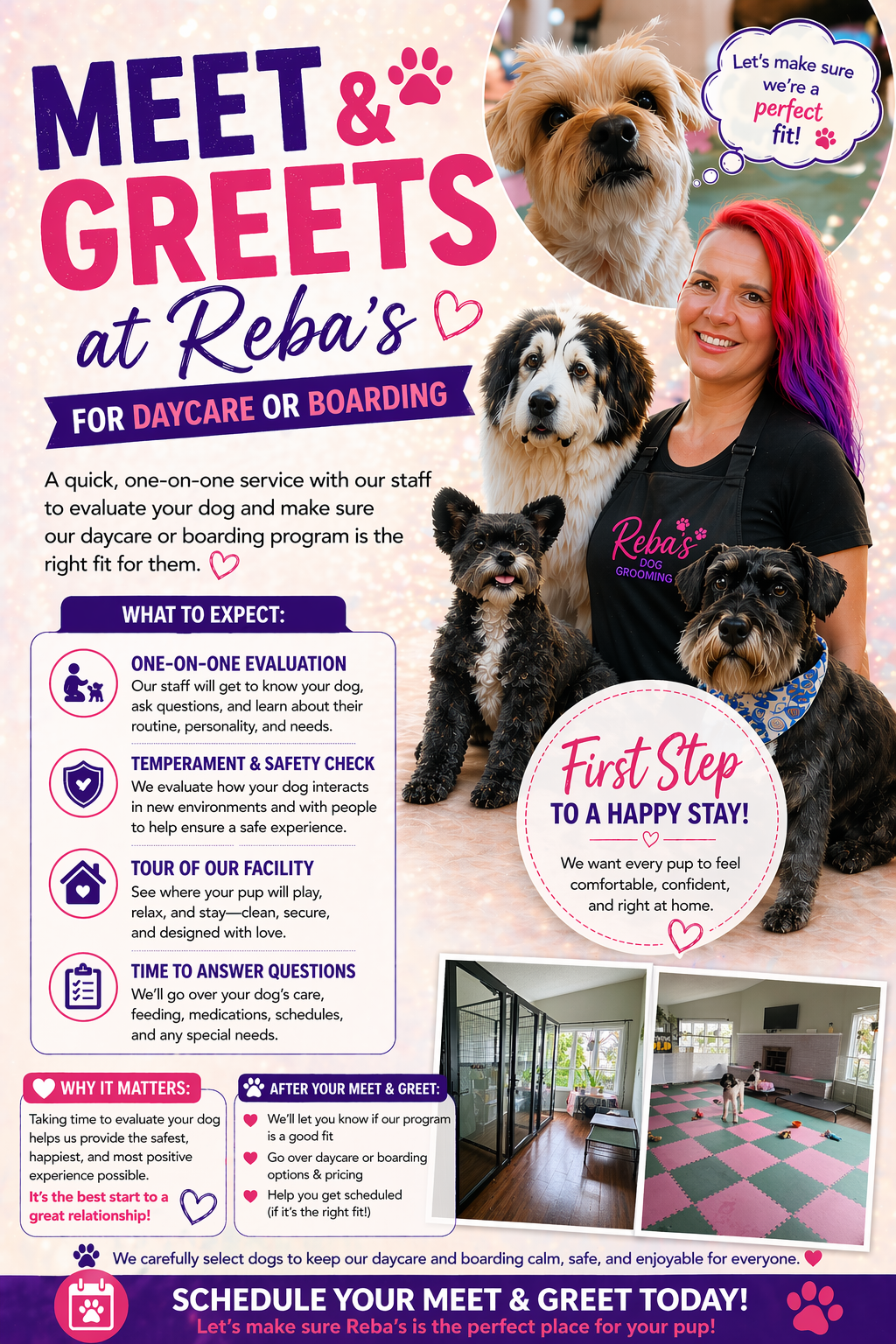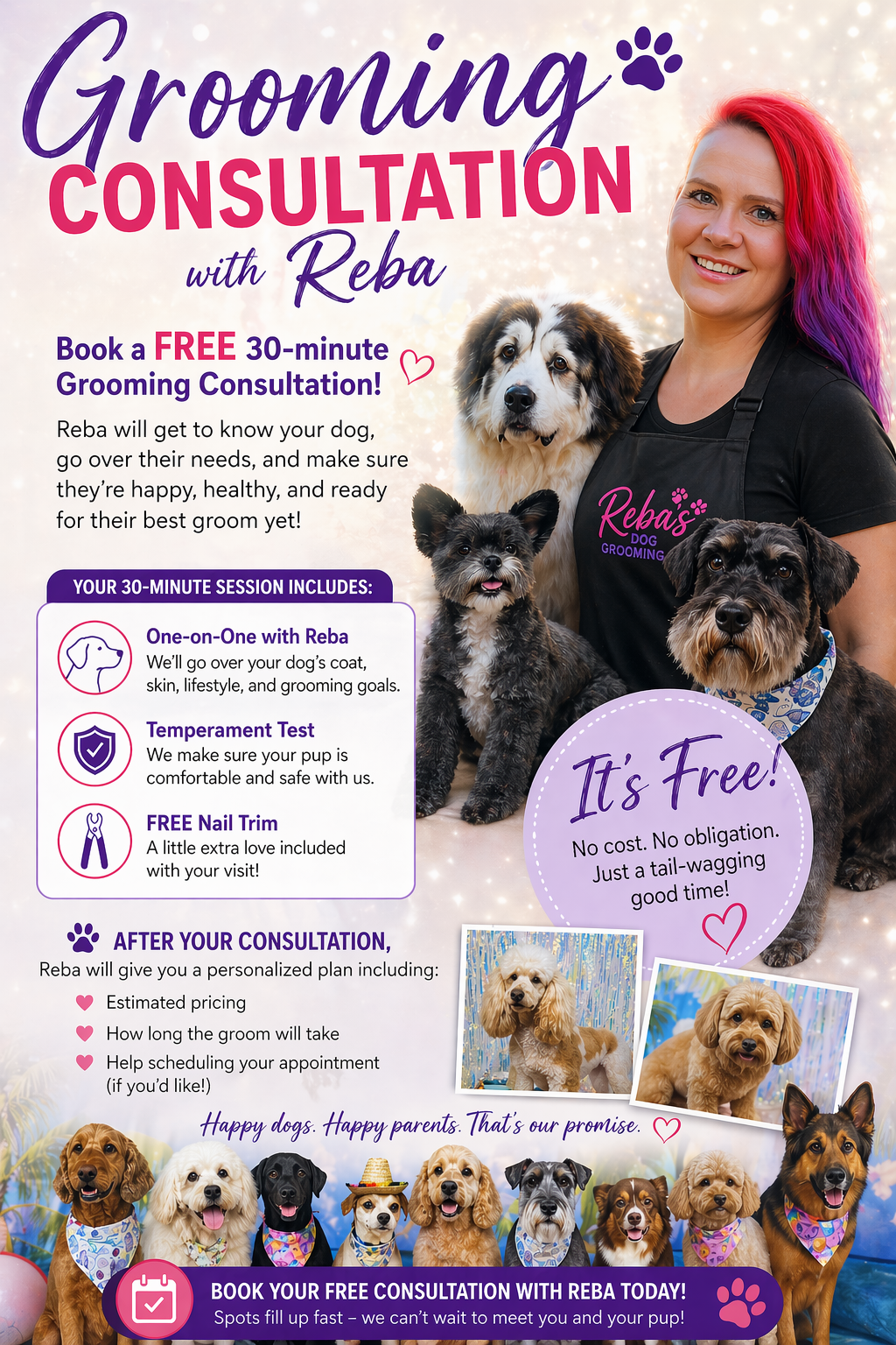 Simply click on “Book NOW! Consultation or Meet & Greet” to be directed to our booking system, where you can schedule appointments at your convenience.